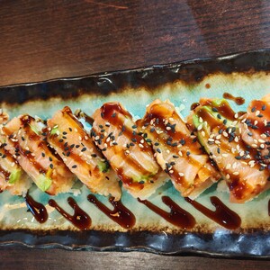 tartare di salmone, avocado, sashimi di salmone, salsa teriyaki | 8 pezzi